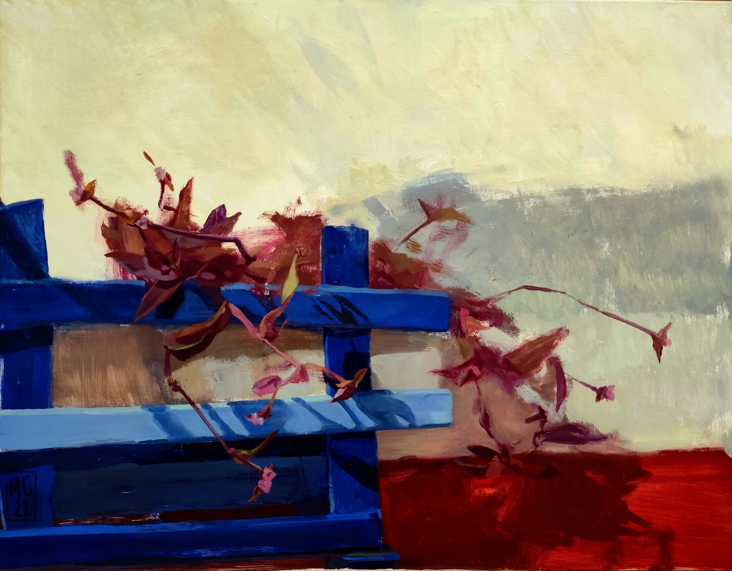 This canvas helps us to find the contrasts that seemingly spontaneously appear in every detail and in every corner. The walls are always white, a traditional and refreshing finish. But the vivid blue wood or the purple bush burst into the snowy wall as the novelty of the century bursts into the inertia of the millennium. How these elements clash or harmonize, complement or contrast, is what the artist asks us to explore in this work.